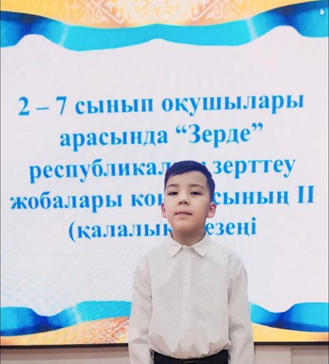 алпы білім беретін пәндер бойынша республикалық «Зерде» ғылыми жобалар конкурсының қалалық кезеңінде №7 мектеп-лицейінің 3 «Е» сынып оқушысы Қайратұлы Айсултан «Квадробика: спорт или искажение сознания» тақырыбында жобаны сәтті қорғап, жүлделі ІІІ-орынмен оралды.